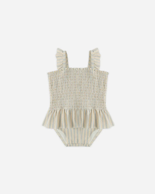 Smocked One-Piece Swimsuit | Blue + Butterscotch Stripe | Quincy Mae