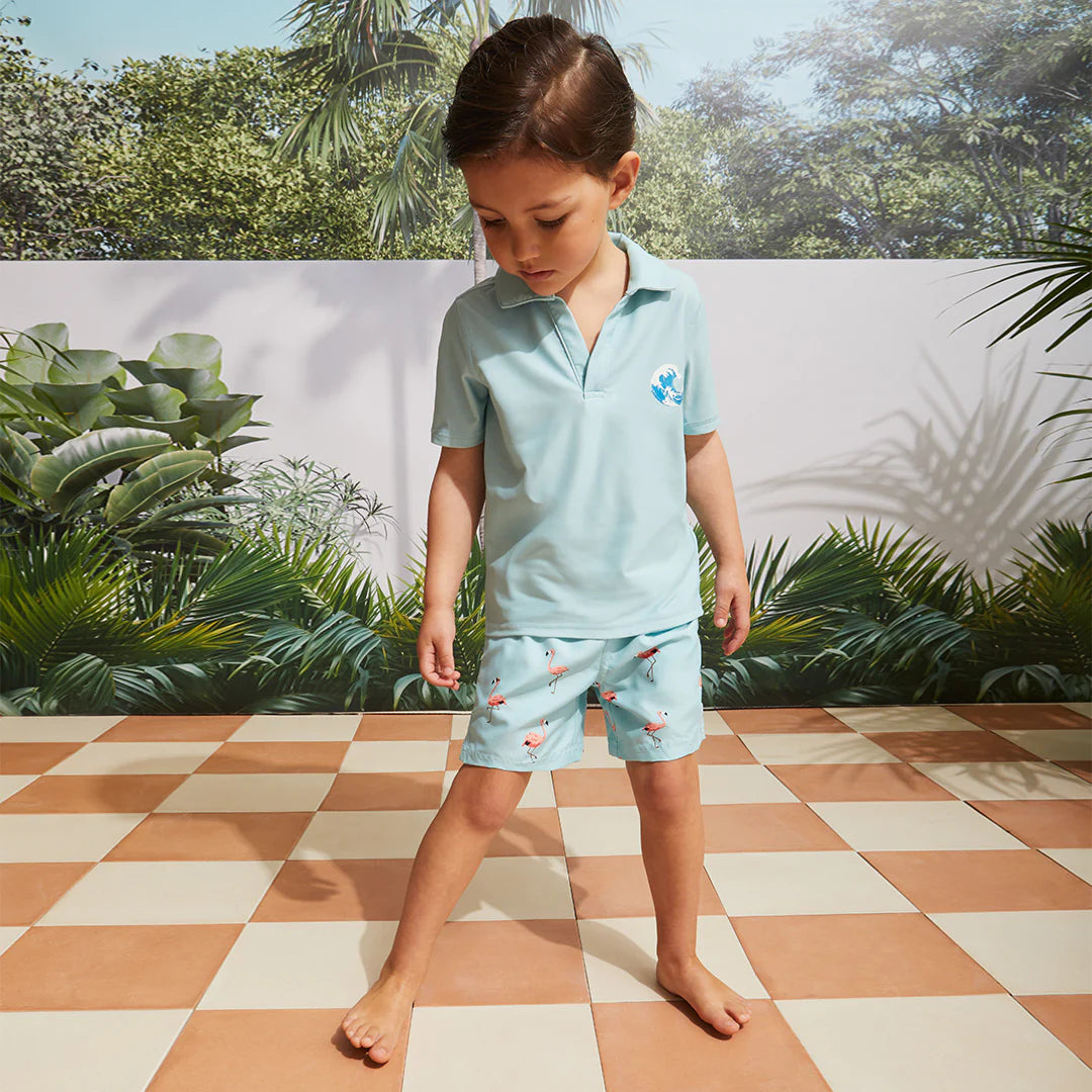 Nothing screams "fun in the sun" quite like a Flamingo print. These blue-as-the-sky swim trunks add even more playfulness to the family vacation while still being super comfortable for your little dude. With an elasticated waistband and a drawstring tie, the trunks have a secure fit that lets him dive, flip and cannonball his way into the pool. There's built-in UPF50+ sun protection, but for extra coverage, try our short-sleeved rash guards from the same range.