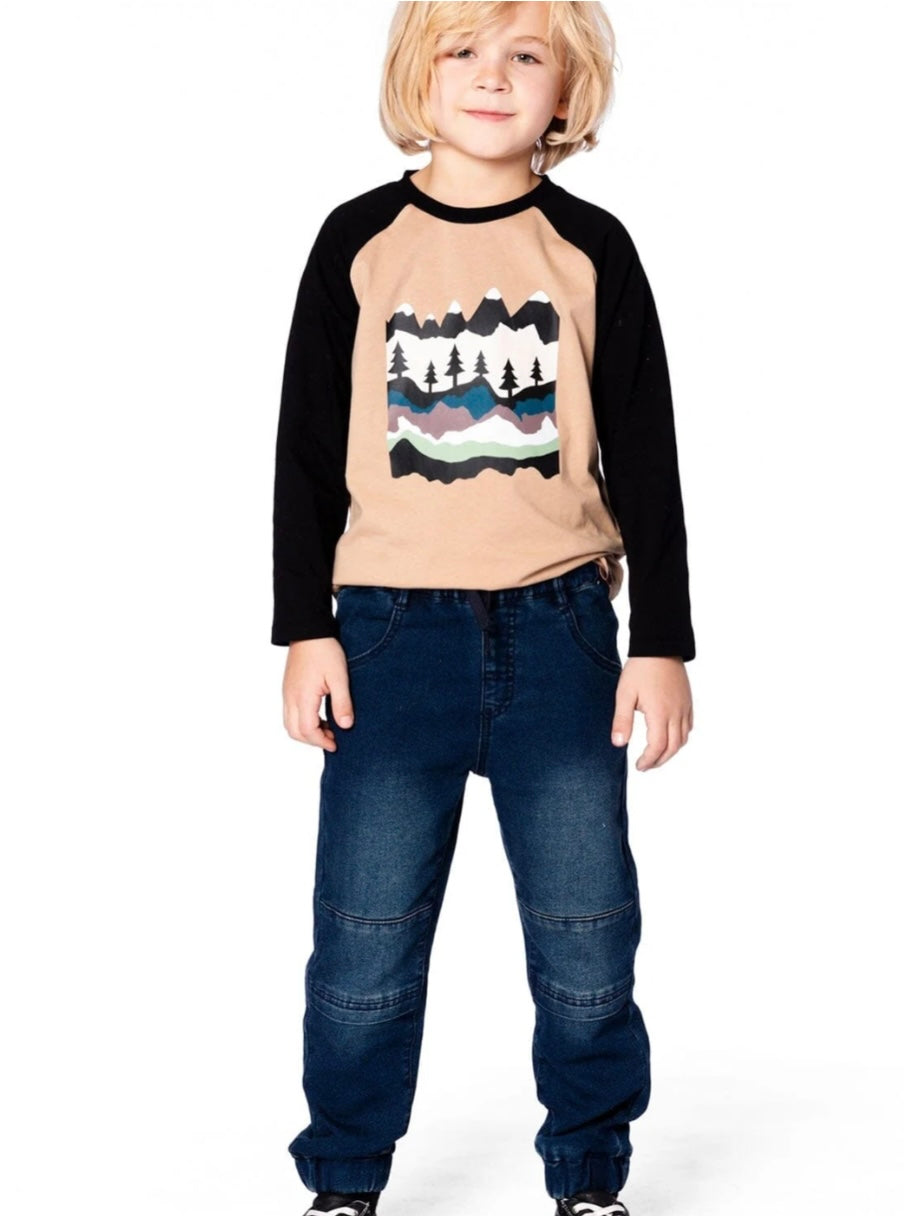With the look of jeans and the feel of sweatpants, he's going to want to wear these French terry joggers on repeat! Made from stretch French terry fabric with a drawstring waistband, these pull-on jogger pants feature scoop front pockets, seamed knee panels, and elastic ankles for total comfort