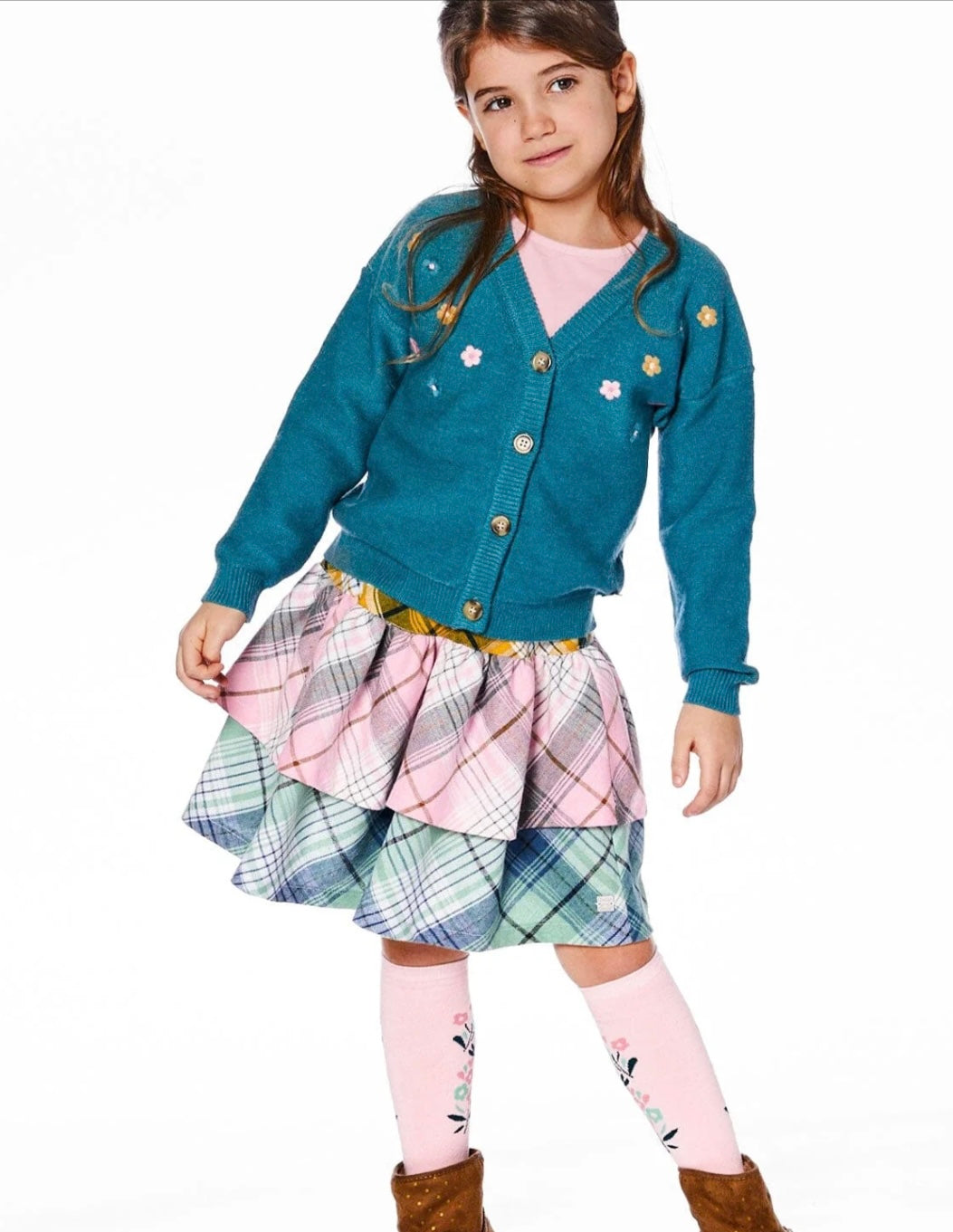 The Knitted Cardigan Dark Green With Flower Embroidery is the perfect layering piece for chilly days. This cozy sweater features an allover knit texture, ribbed cuffs and trims, front button placket, and multicolored embroidered flowers scattered across the shoulders and chest.