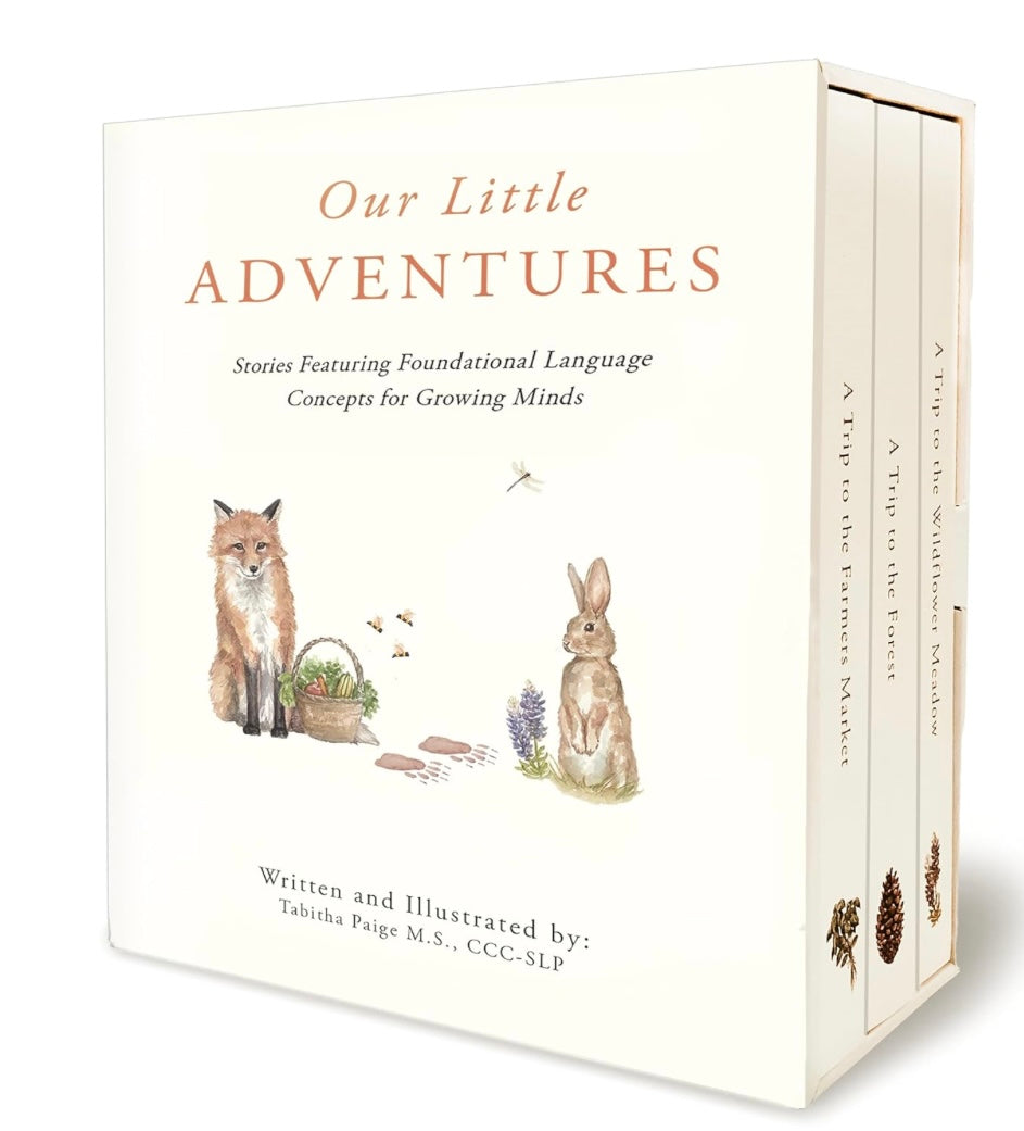 Created by licensed speech pathologist and artist Tabitha Paige, MS, CCC-SLP, the three board books in the Our Little Adventures box set take parents and toddlers or young children on trips to the farmers market, the forest, and a wildflower meadow. Each book features realistic watercolor imagery and a story carefully crafted by Tabitha, who has years of experience helping young children develop their language skills.