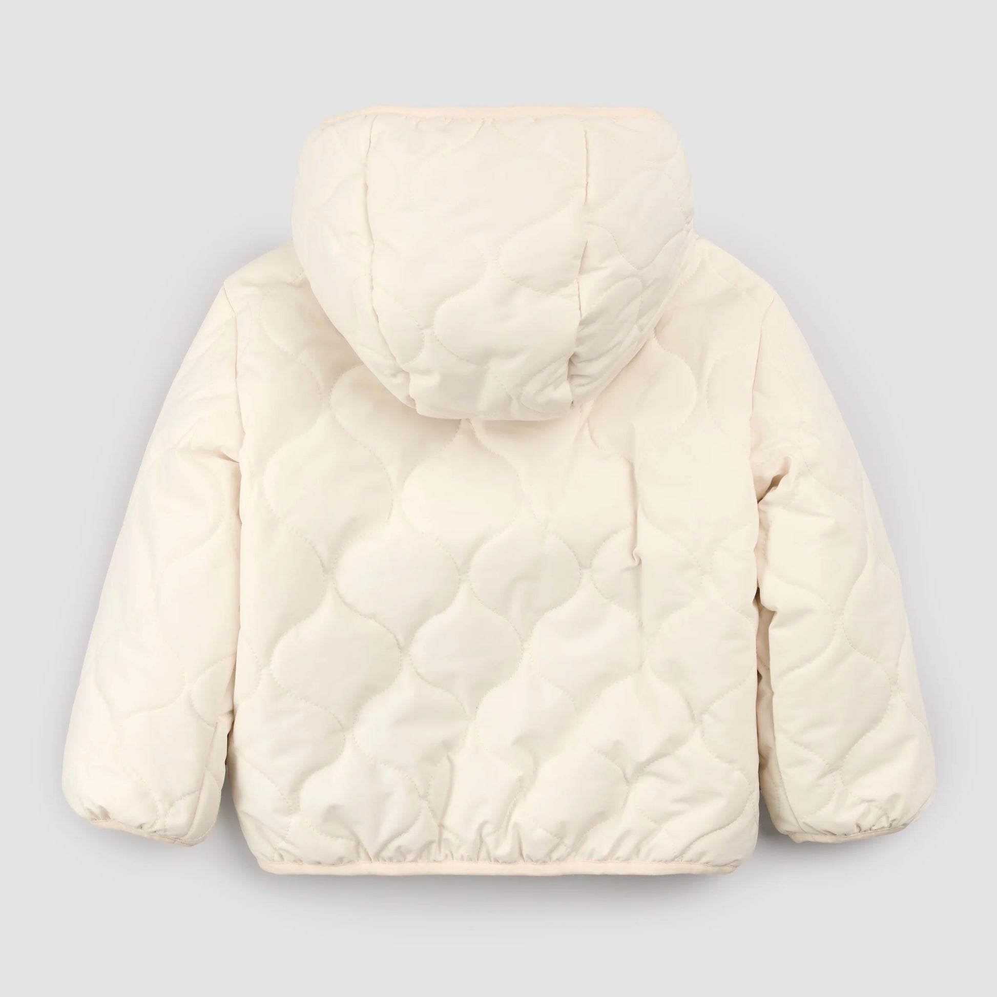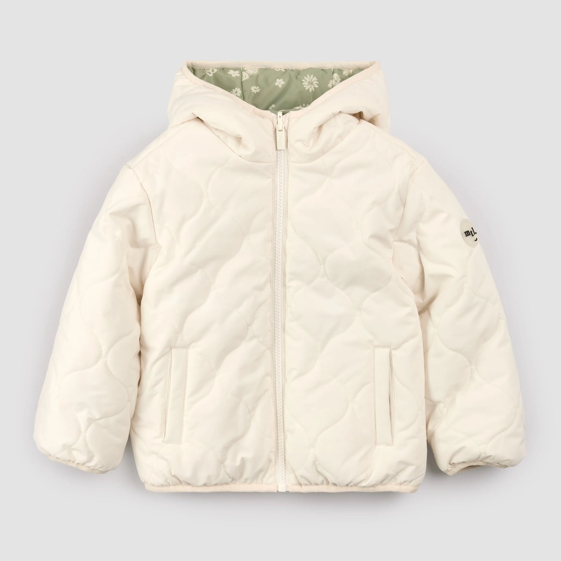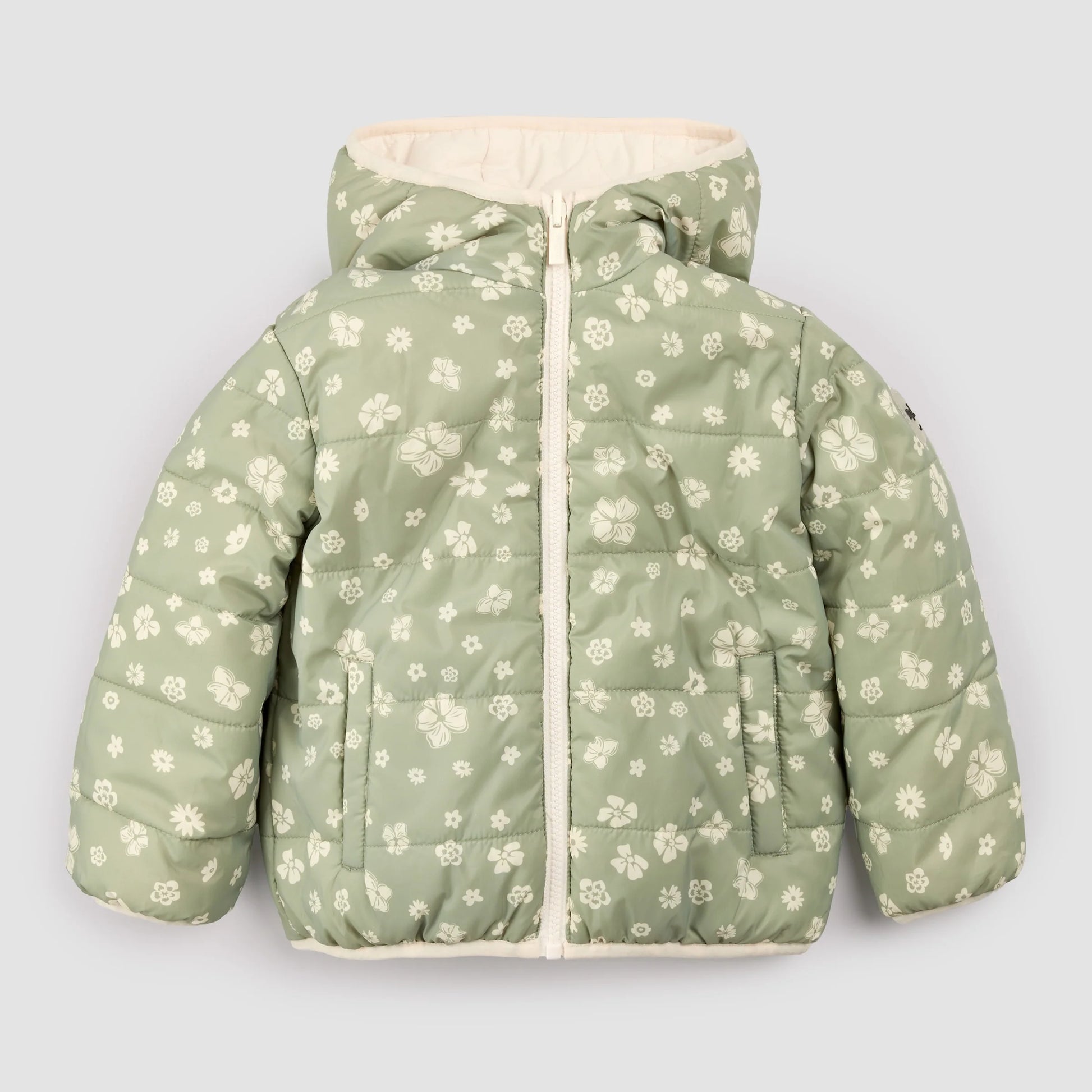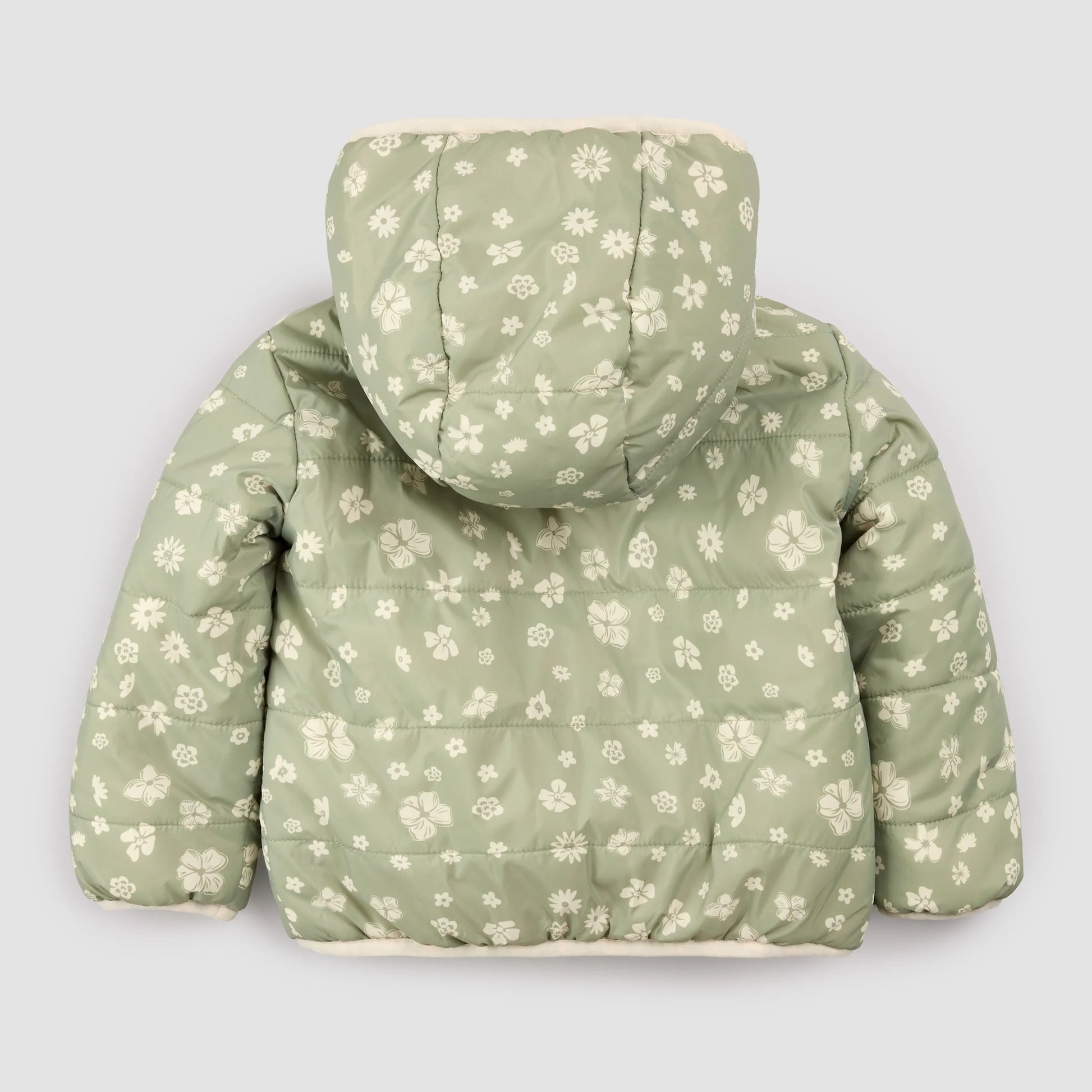 Two looks in one! This reversible jacket offers a sage, ditsy floral print on one side and a plain quilted texture on the reverse. Perfect for always coordinating with their outfits, the reversible jacket will see them through the Fall, protecting them from the wind and rain. With a cozy, face-hugging hood and a full-length zip, the jacket keeps out the cold while she heads for the school bus or plays in the garden.