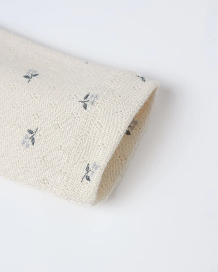 This sweet pointelle jumpsuit features delicate ruffle detail along the zipper, combining cozy comfort with timeless charm.
