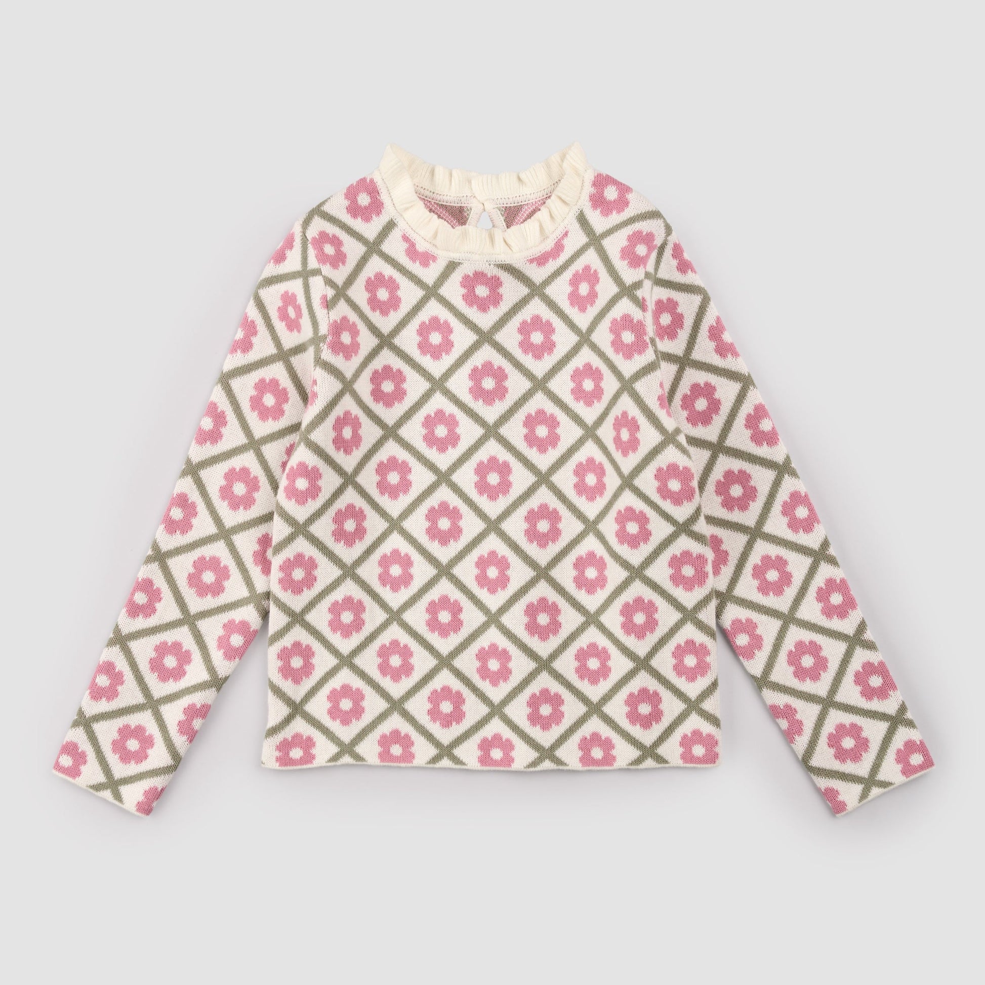 This floral, intarsia sweater brings a timeless elegance to their everyday wardrobe. Crafted from 100% organically grown cotton birdseye, the piece is light yet warm and offers a vintage style. The sweater features a practical loop fastening at the back for easy dressing and a delicate ruffle trim around the neckline. Perfect for adding color and sweetness to any grey day.