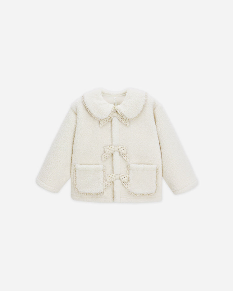 Darling Shearling Collared Coat adorned with fixed crochet bows and delicate lace trim for a sweet, prim-and-proper touch.