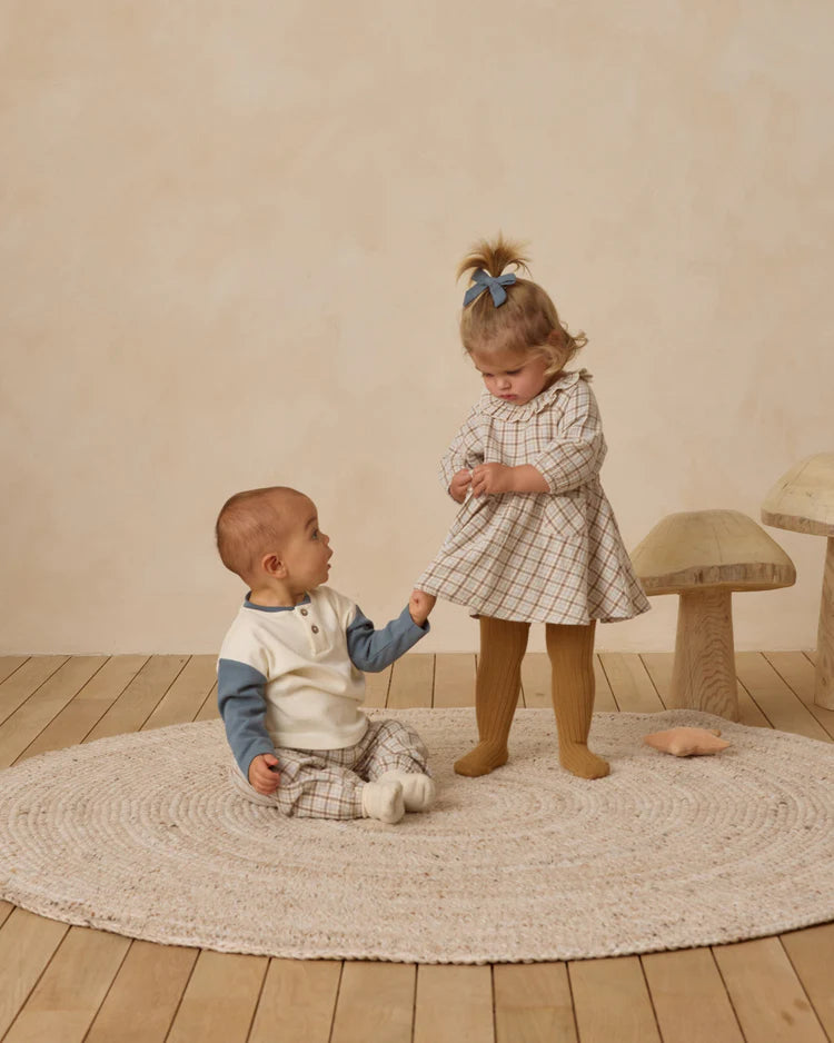 Our sweet Simone Dress features long sleeves, a curved waistline, front patch pockets, and a darling collar. A zipper at the back allows for easy dressing—perfect for everyday charm and comfort. Coordinating bloomers included with all sizes.