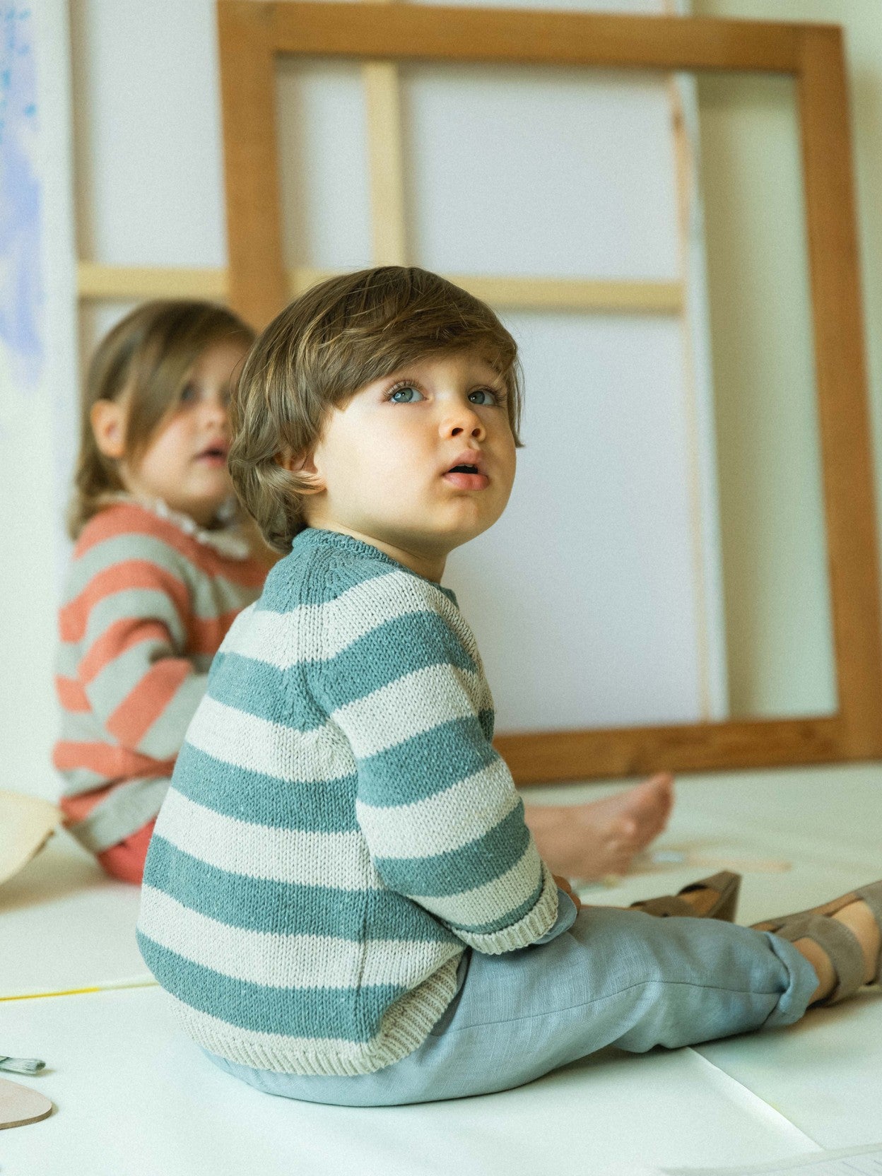 Striped jumper knitted with 62% to 75% recycled cotton. Piece with handmade effect fastens with wooden buttons on the front up to 24 months. Cotton from end-of-life pieces from all over the world.