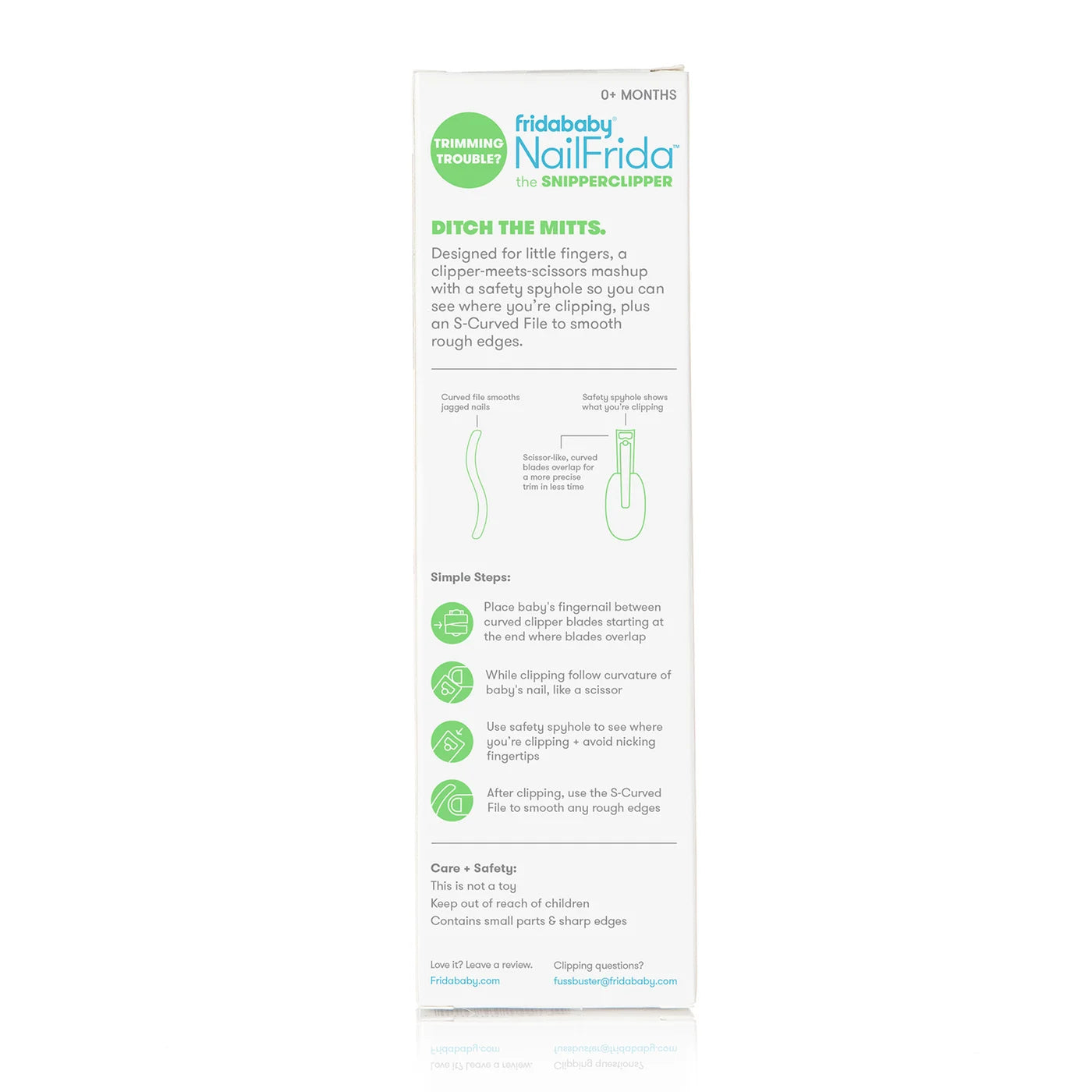 Tackle all of your trimming troubles without nicking baby's sensitive skin with the NailFrida SnipperClipper Set. See what you're snipping through the safety spyhole and nail that mani/ pedi every time. NailFrida's specially curved blades mimic the shape of a baby scissor and are uniquely designed for smooth and silent snipping. Smooth sharp corners with the curved S-file that's shaped just for baby- a must for newborn care.