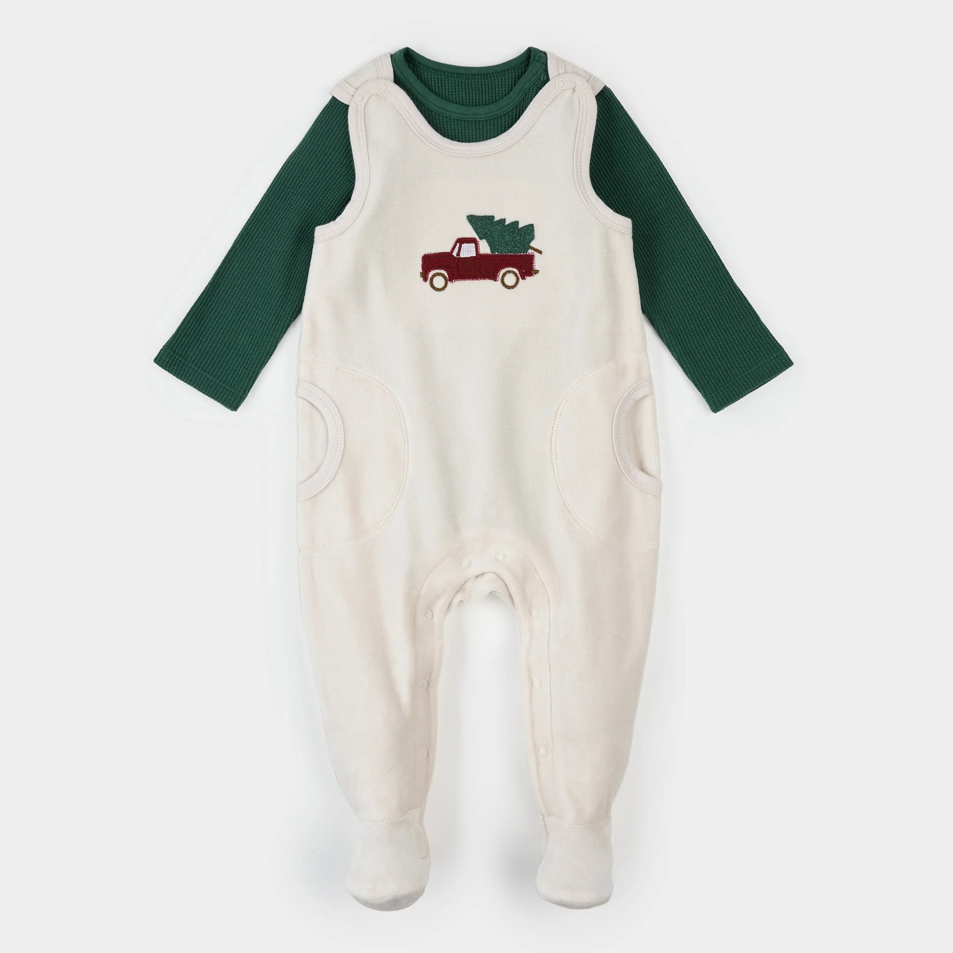 This festive set includes a thermal bodysuit and soft velour overalls with a Festive Truck motif. The overalls have a cozy fit with integrated feet and snap button straps for easy dressing. It’s the perfect fit for keeping your littlest guy warm and snug when heading out with the family in the stroller.